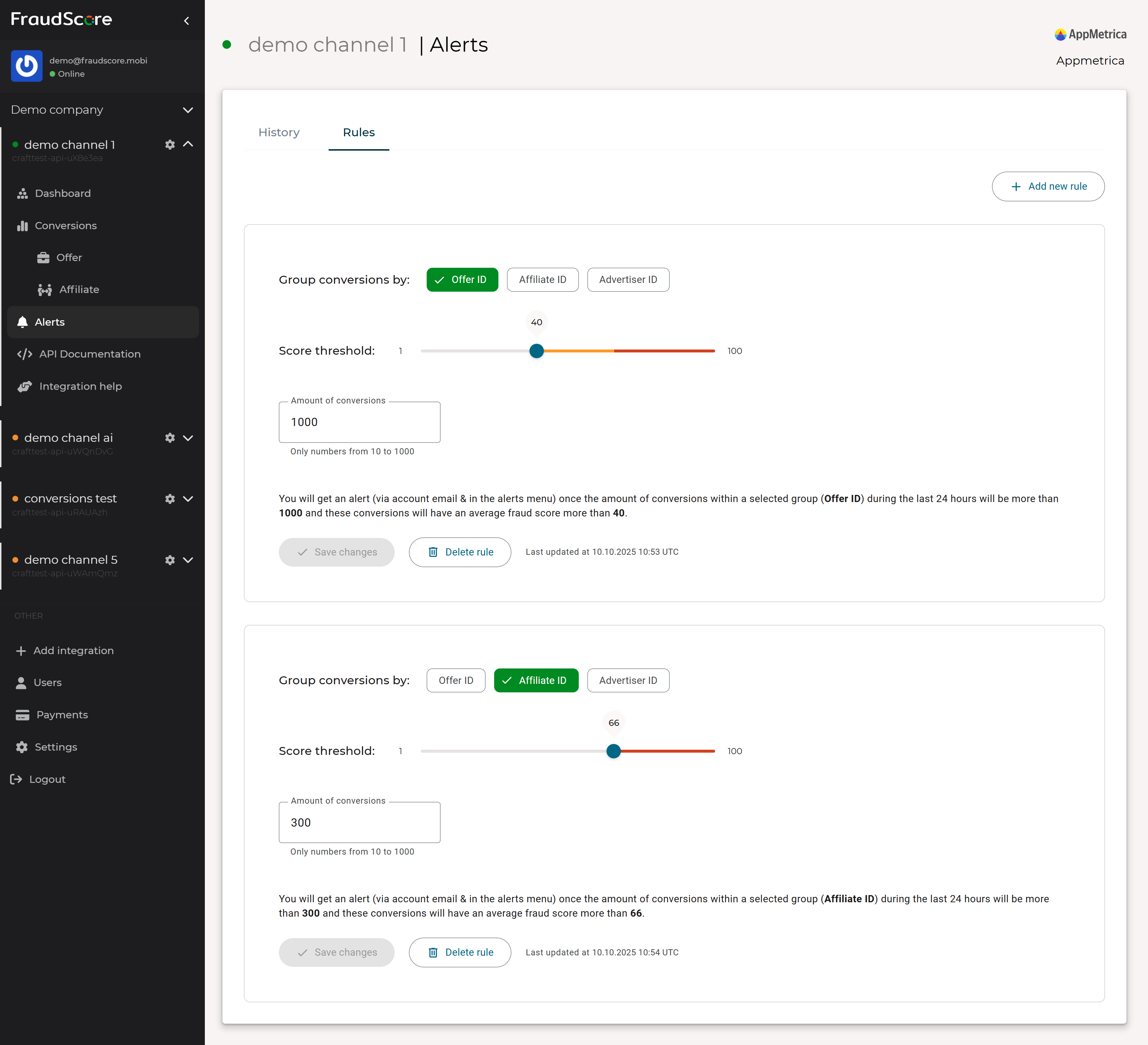 FraudScore helps marketers and managers monitor traffic quality and automate their workflow with the following features: Alerts and SmartReject. These tools work effectively together, safeguarding your ad budget and freeing you from routine tasks.